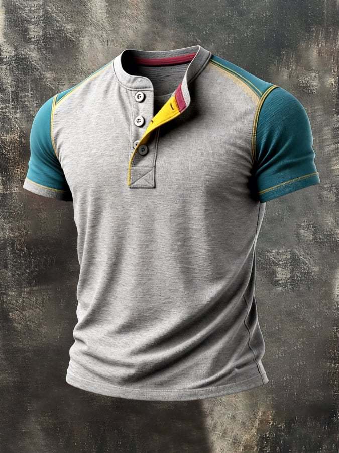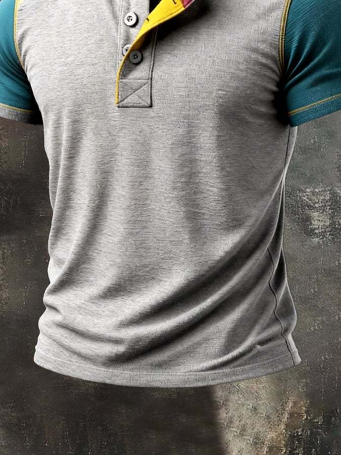 Men's Retro Patchwork Color Block Henley Collar Short-Sleeve Top