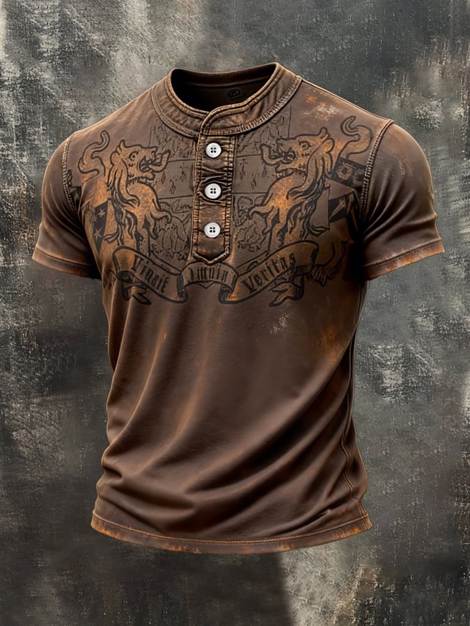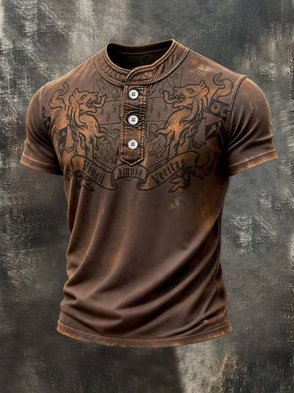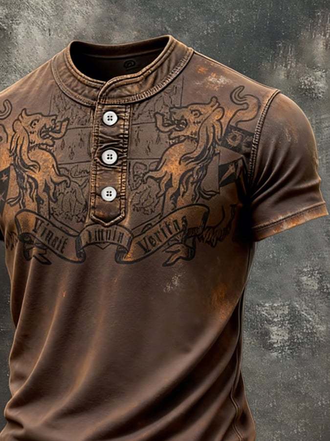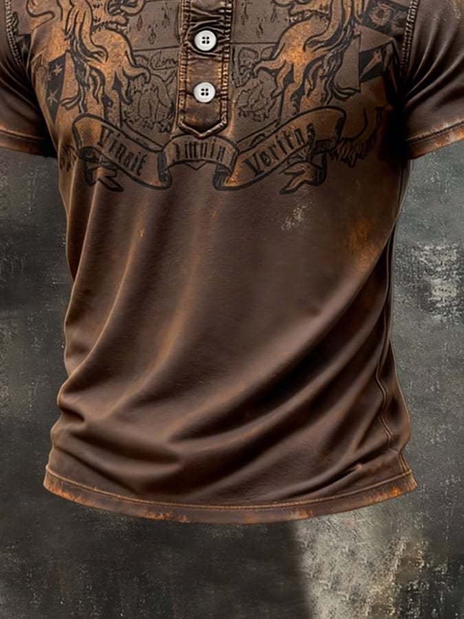 Men's Retro Print Color Block Henley Collar Short-Sleeve Top