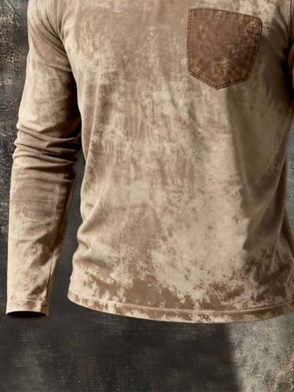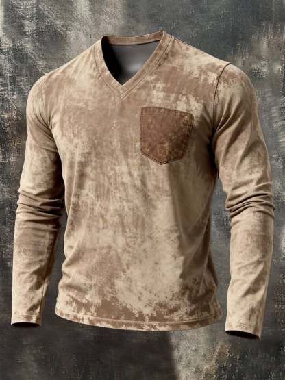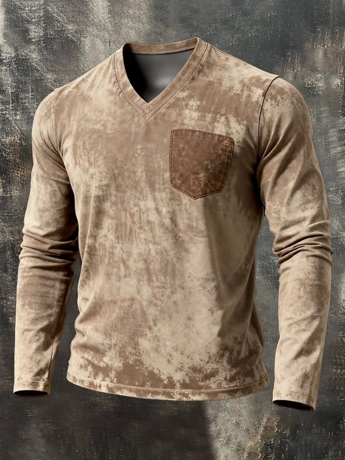 Men's Retro Washed Distressed V-Neck Long-Sleeve Top