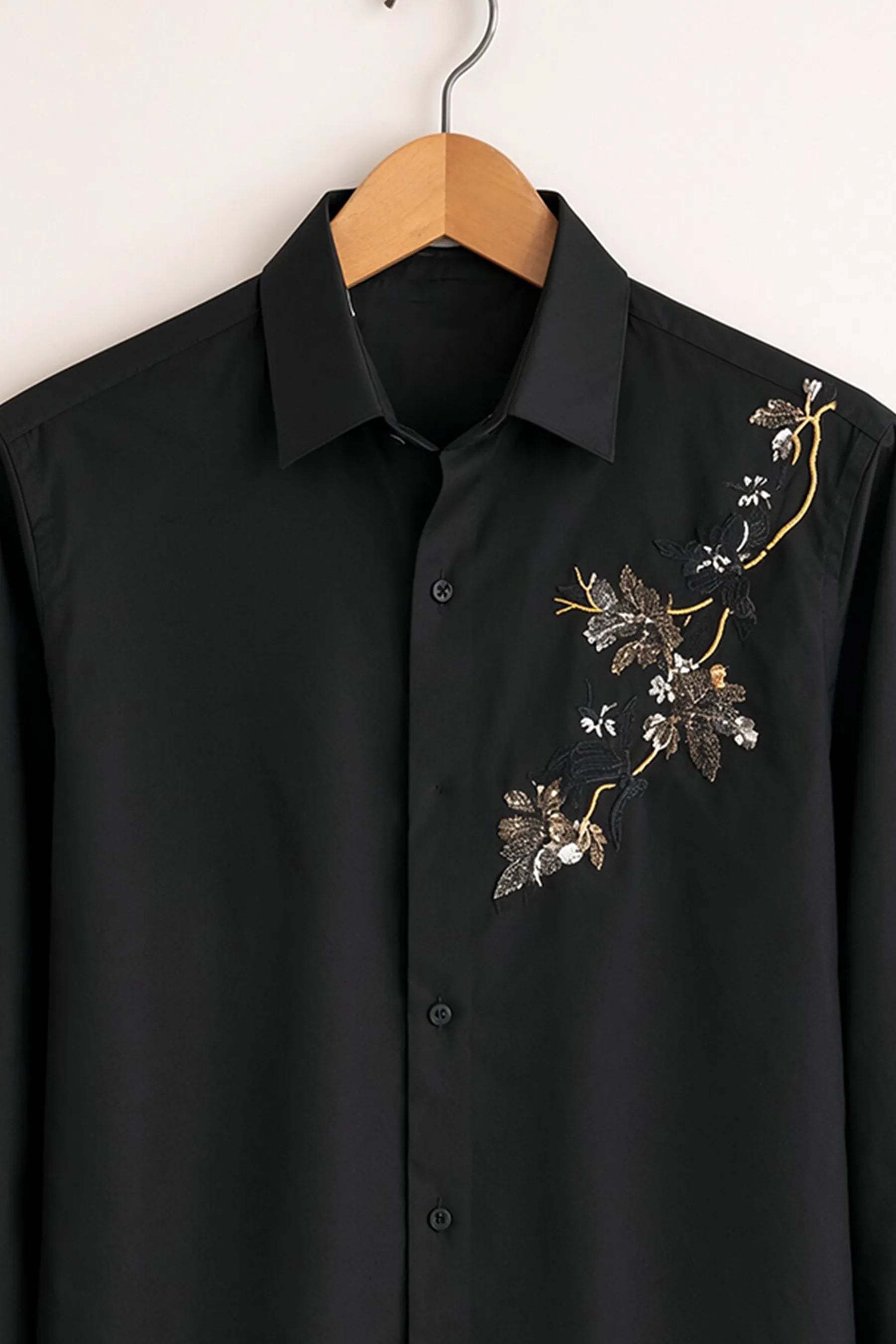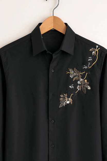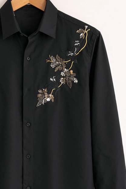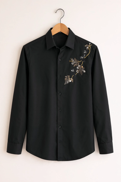 Refined, bold, and effortlessly elegant—the TokyoMen Embroidered Floral Accent Shirt is designed for men who appreciate understated luxury. Crafted on a deep jet-black base, this shirt features a delicate metallic floral embroidery cascading across the chest, adding a subtle yet striking focal point.