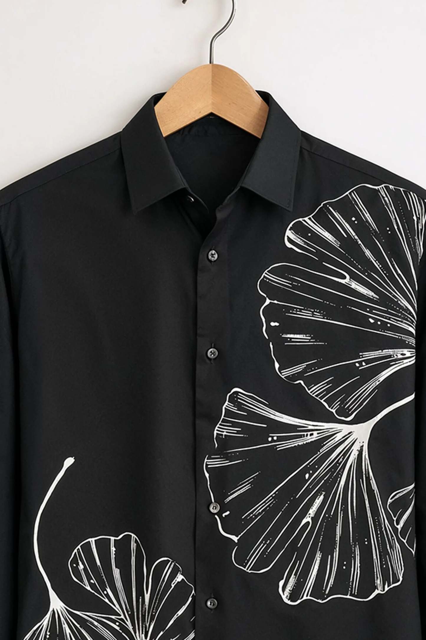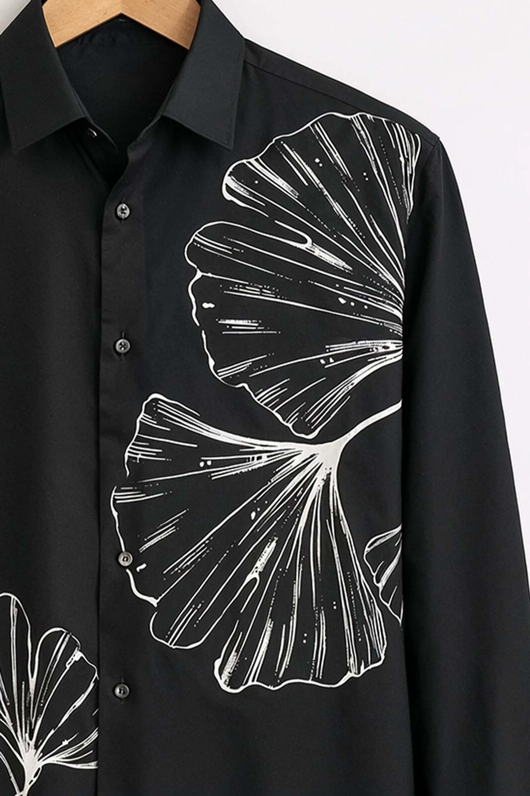 Sleek, artistic, and effortlessly modern—the TokyoMen Monochrome Leaf Print Shirt is designed for men who appreciate statement minimalism. Crafted on a deep jet-black base, this shirt features striking white line-art leaf illustrations placed asymmetrically across the front, creating a sharp contrast and a contemporary, gallery-inspired look.