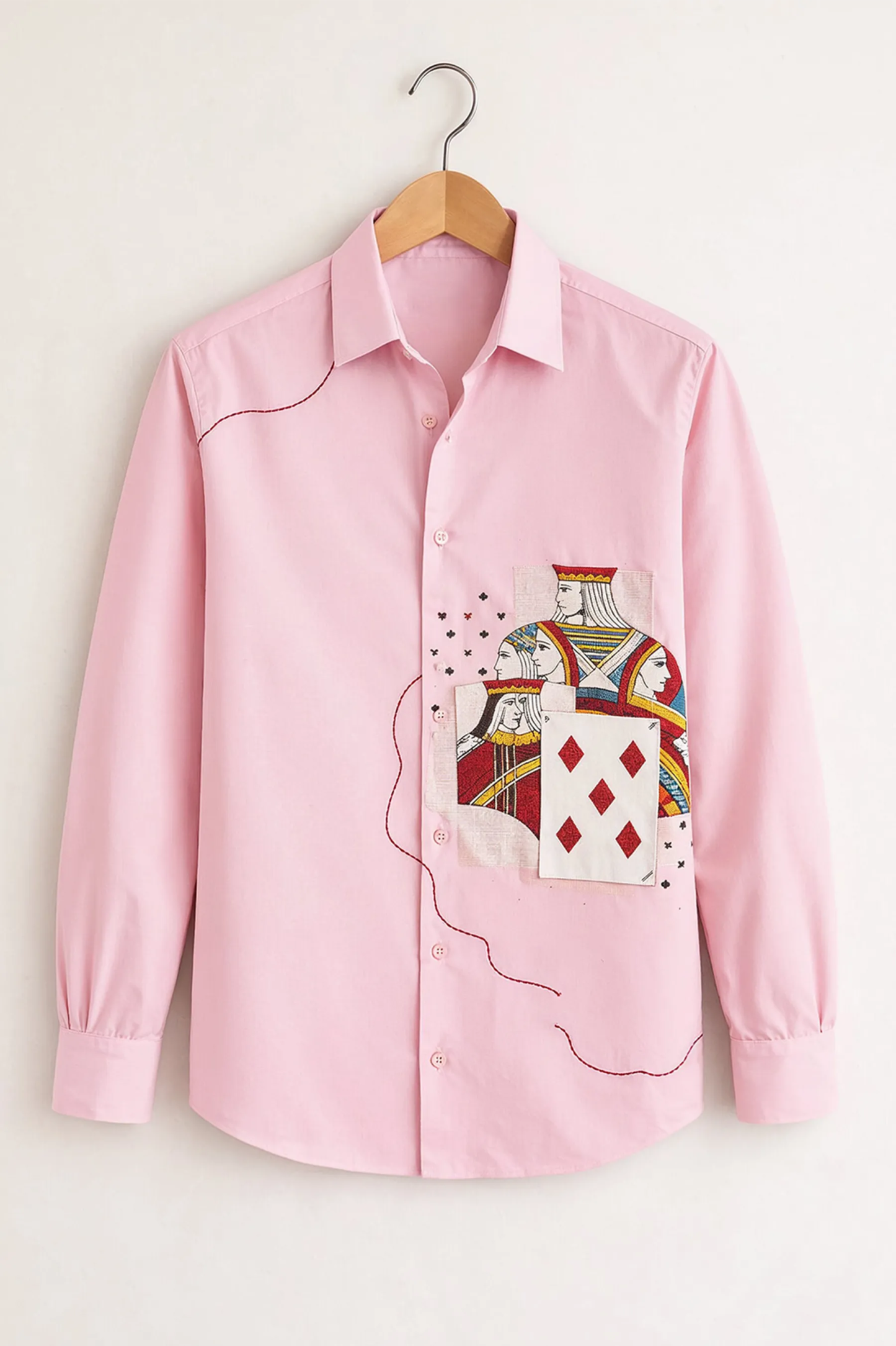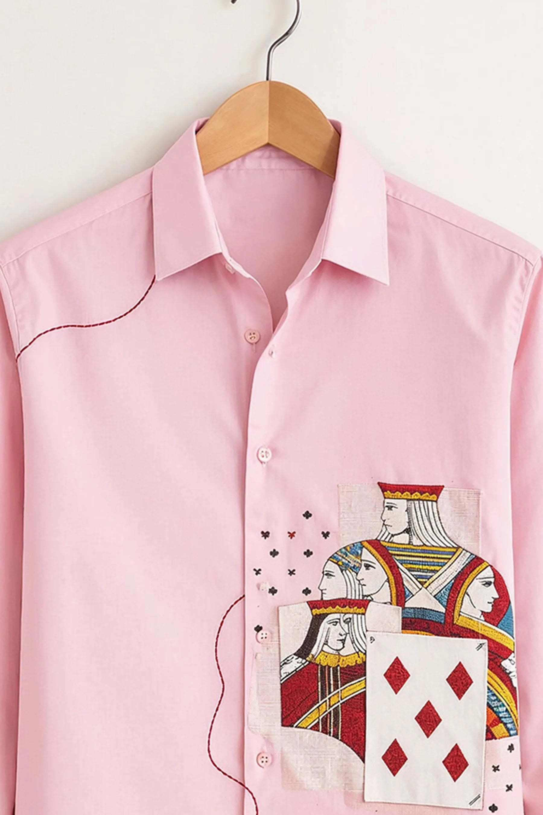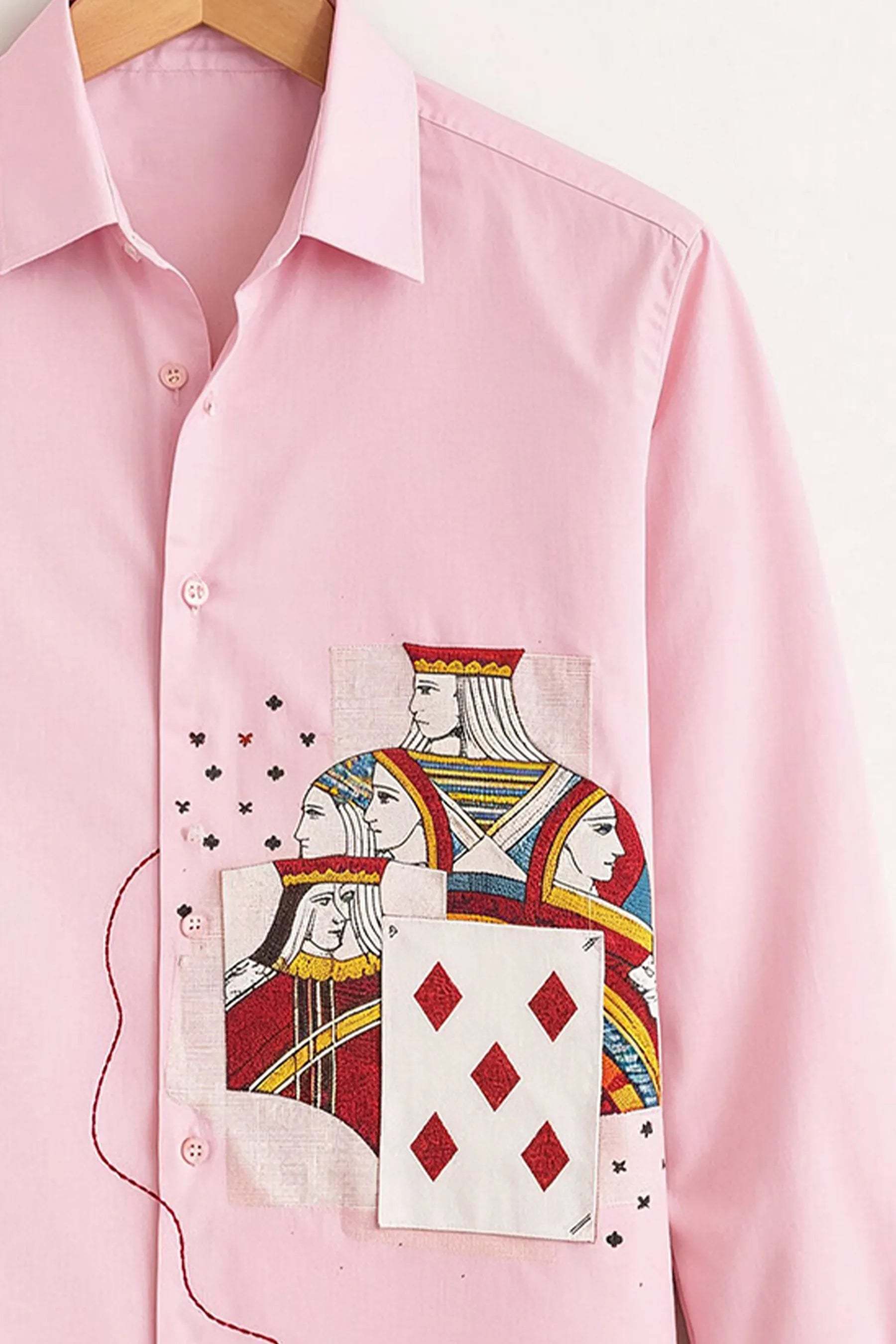 Add a touch of artistic charm to your wardrobe with the TokyoMen Royal Card Patch Shirt. Set on a soft blush pink base, this shirt features a unique playing-card inspired patch artwork, showcasing royal face cards stitched with fine detailing for a bold yet refined statement.
