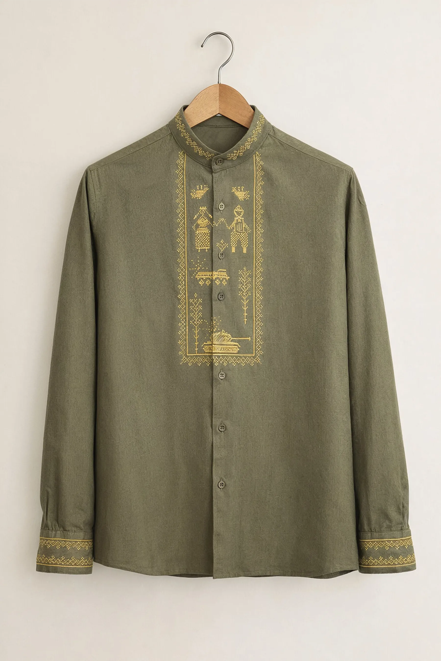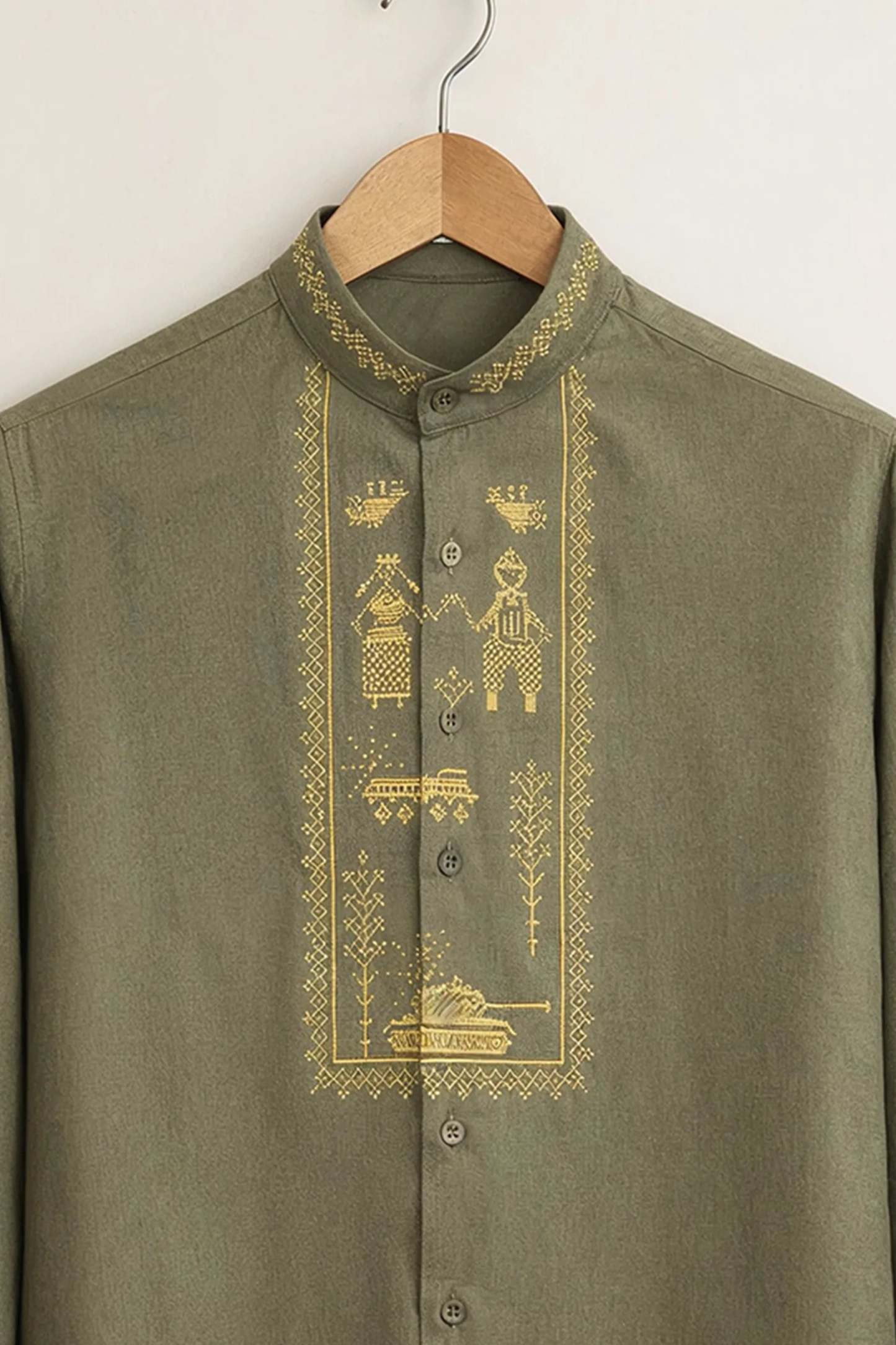 Rooted in tradition and refined for the modern wardrobe, the TokyoMen Tribal Embroidery Shirt is a statement piece that blends cultural storytelling with contemporary elegance. Crafted in a rich olive green tone, this shirt features a stand collar (mandarin collar) and a beautifully detailed golden tribal embroidery panel running along the placket.