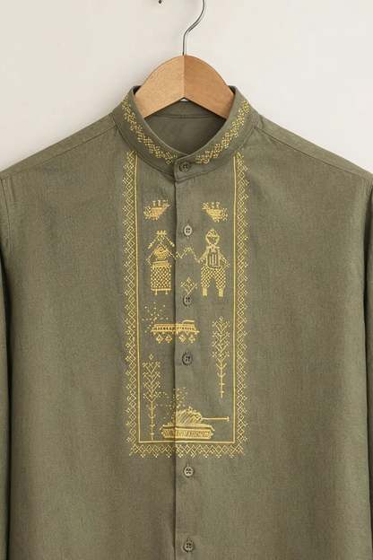 The embroidery showcases symbolic motifs inspired by indigenous art forms—depicting heritage elements, village life, and geometric borders—stitched with precision to add depth and character without overwhelming the design. Subtle matching embroidery on the collar and cuffs completes the look with understated sophistication.
